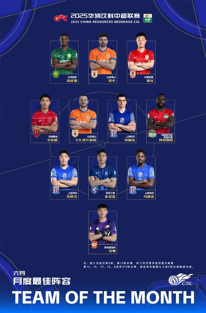 7月18日讯 中超官方公布了6月最佳阵容,本次最佳阵容采用3-4-3阵型。最佳阵容名单如下: